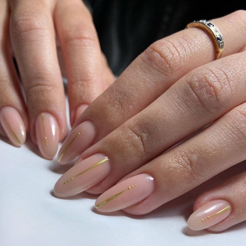This elegant gold nail design features a soft nude base with delicate gold lines and tiny metallic dots. The minimalist details create a clean and sophisticated manicure perfect for everyday wear.