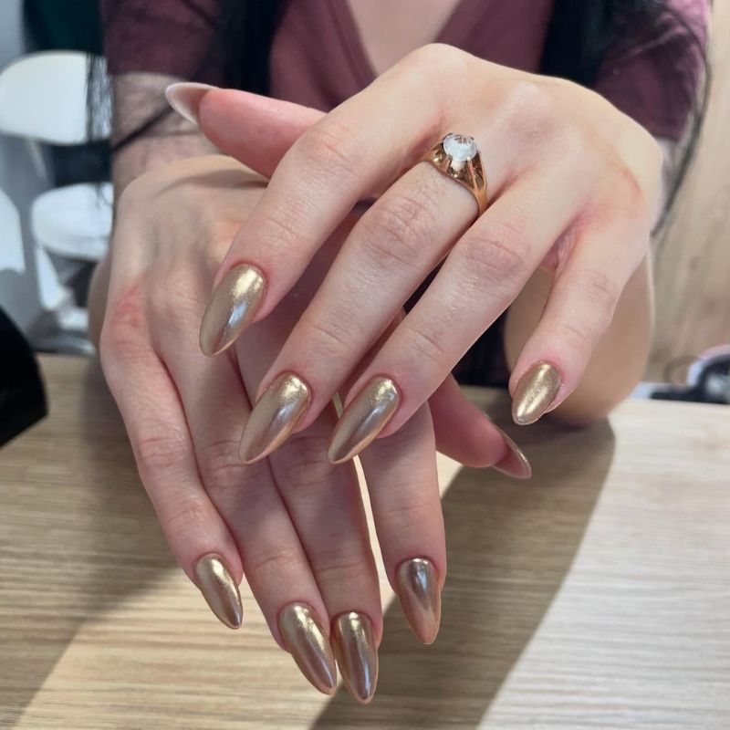 These almond-shaped nails feature a champagne gold chrome finish that looks elegant and refined. The warm metallic tone enhances the natural beauty of the nails.