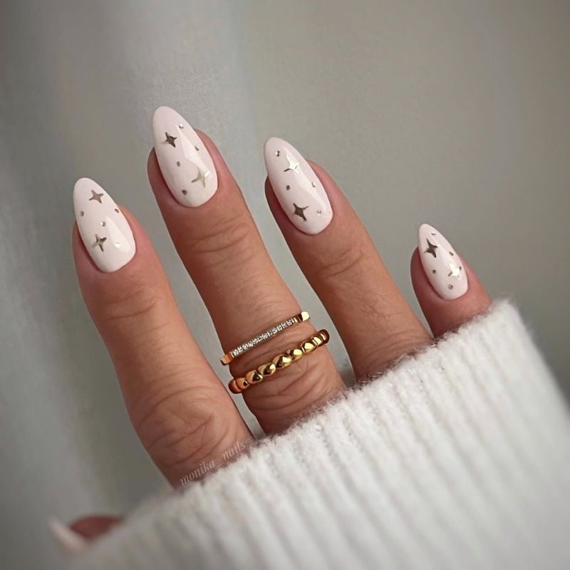 A clean white base decorated with small gold stars creates a playful yet elegant manicure. This celestial gold nail design feels delicate and stylish.