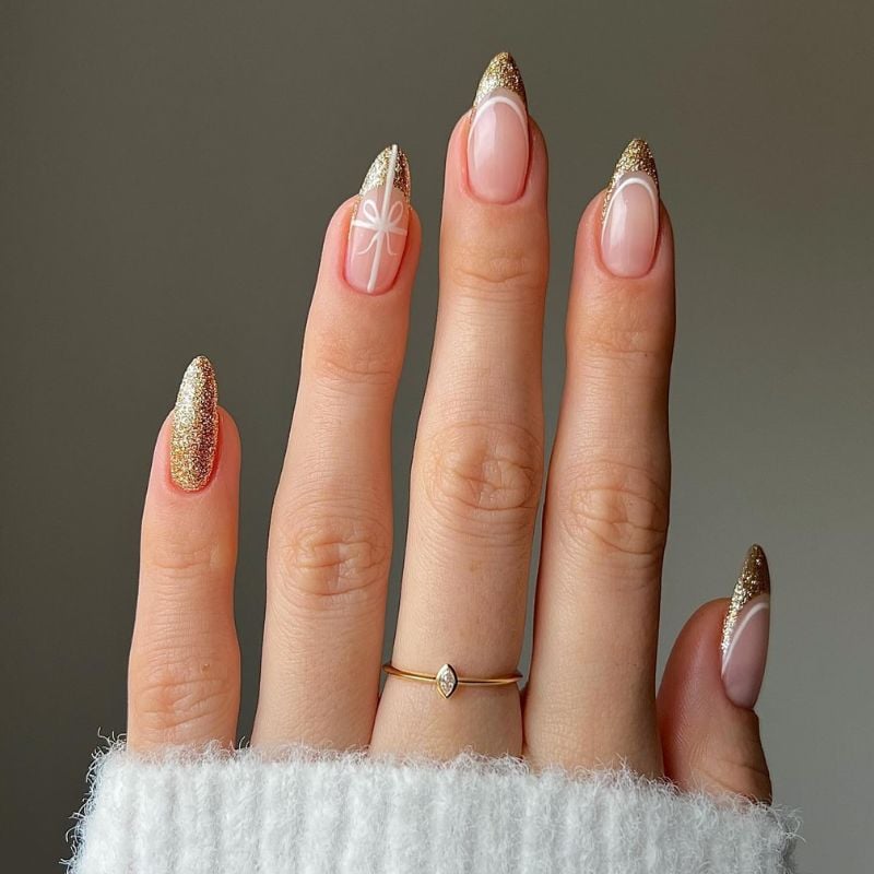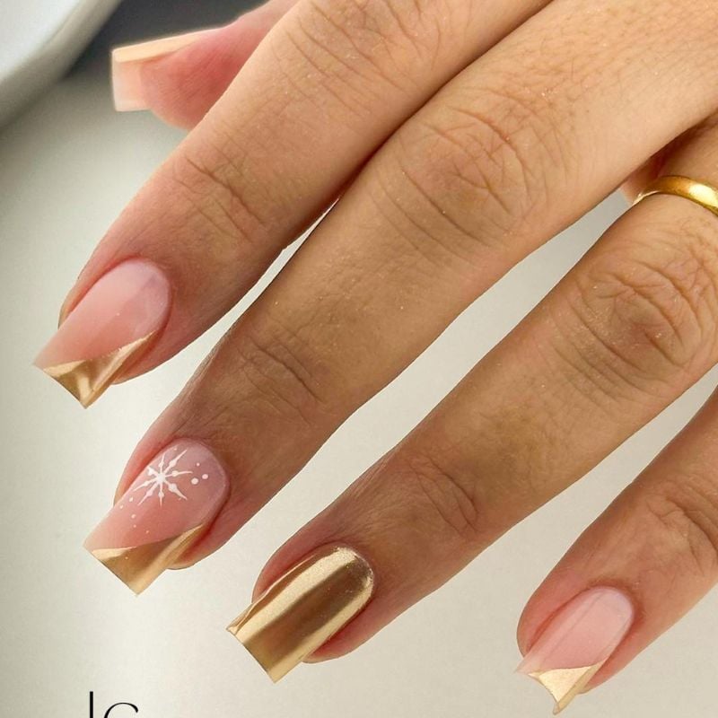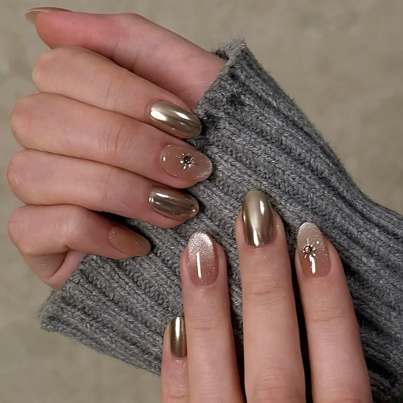 A mix of gold chrome, glitter, and nude tones creates a cozy yet elegant manicure. The small star accents add a charming winter-inspired detail.