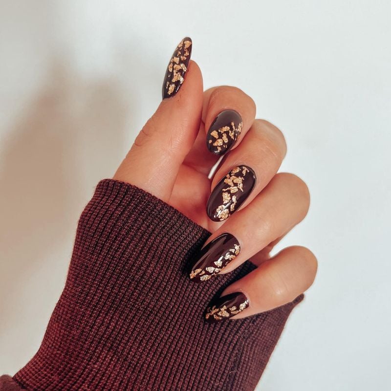 This bold manicure features deep chocolate-brown polish with scattered gold-foil flakes. The contrast between dark tones and metallic gold creates a dramatic look.