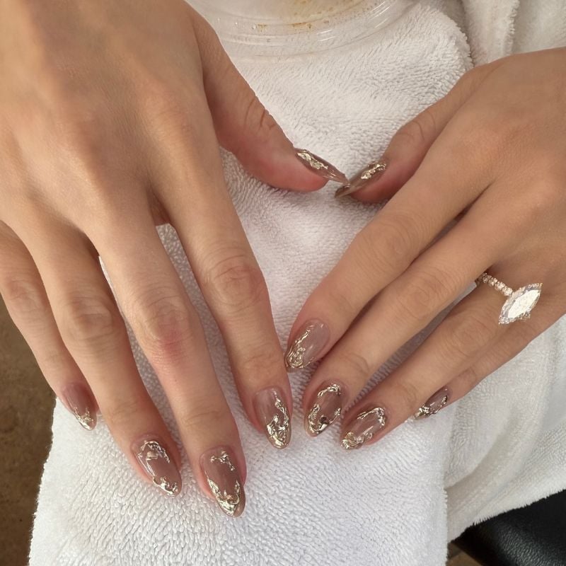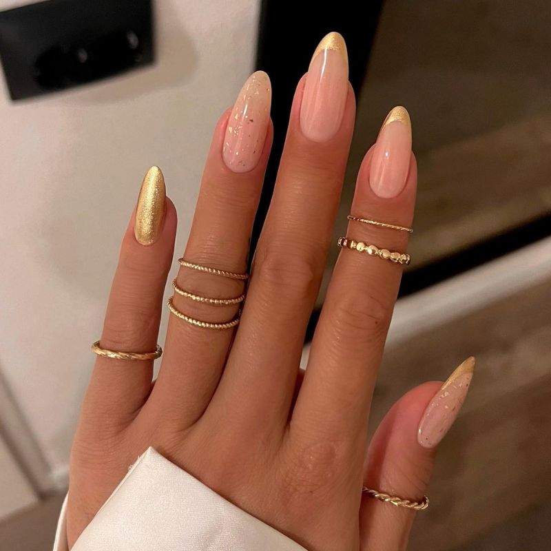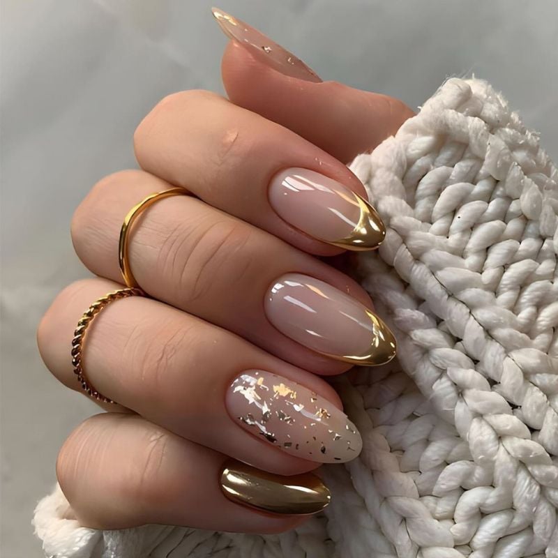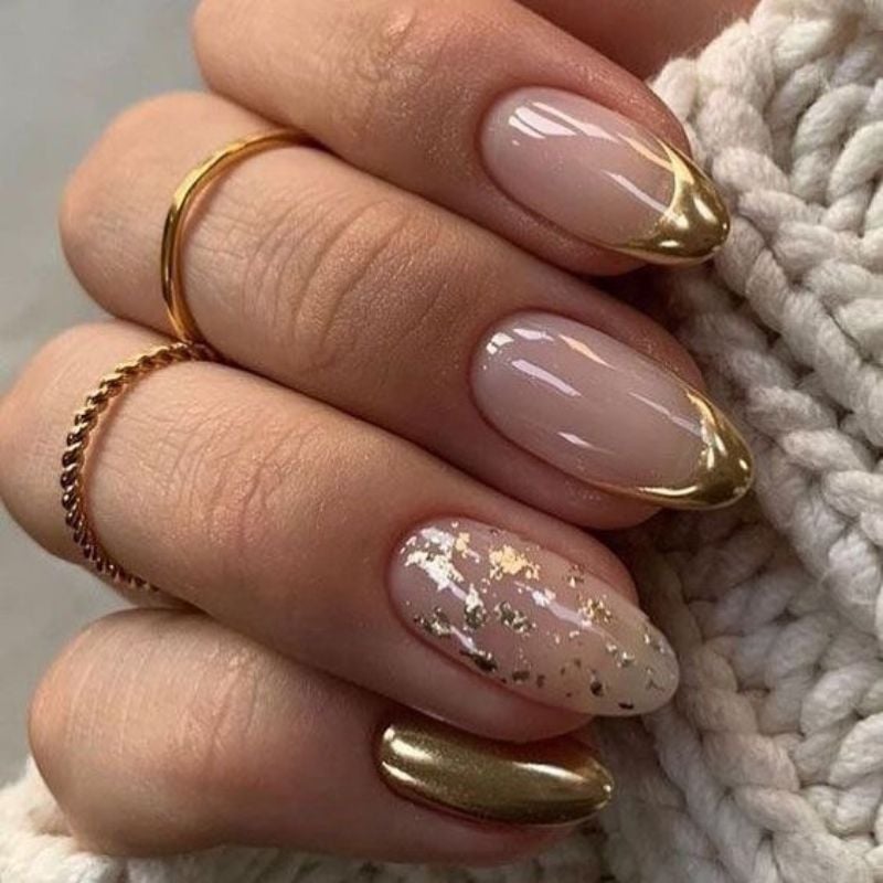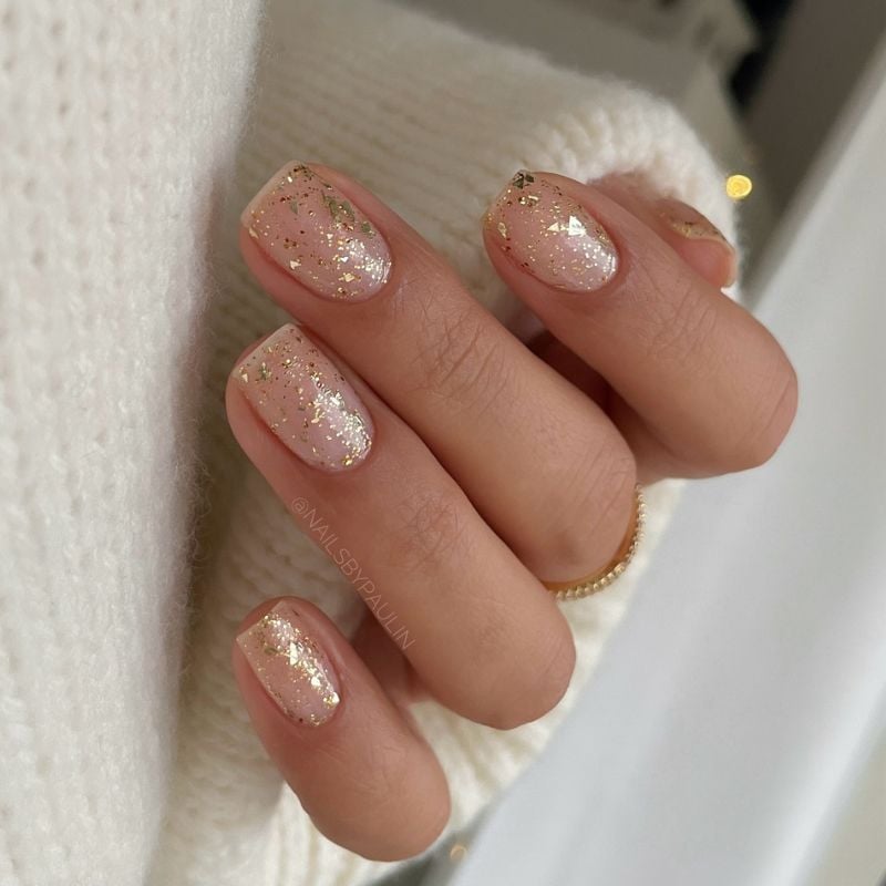 A soft nude manicure paired with gold-foil accents creates a luxurious, artistic gold nail design. The metallic flakes add texture while keeping the look elegant.