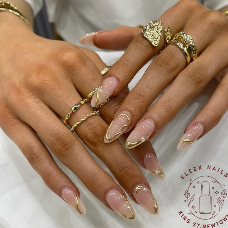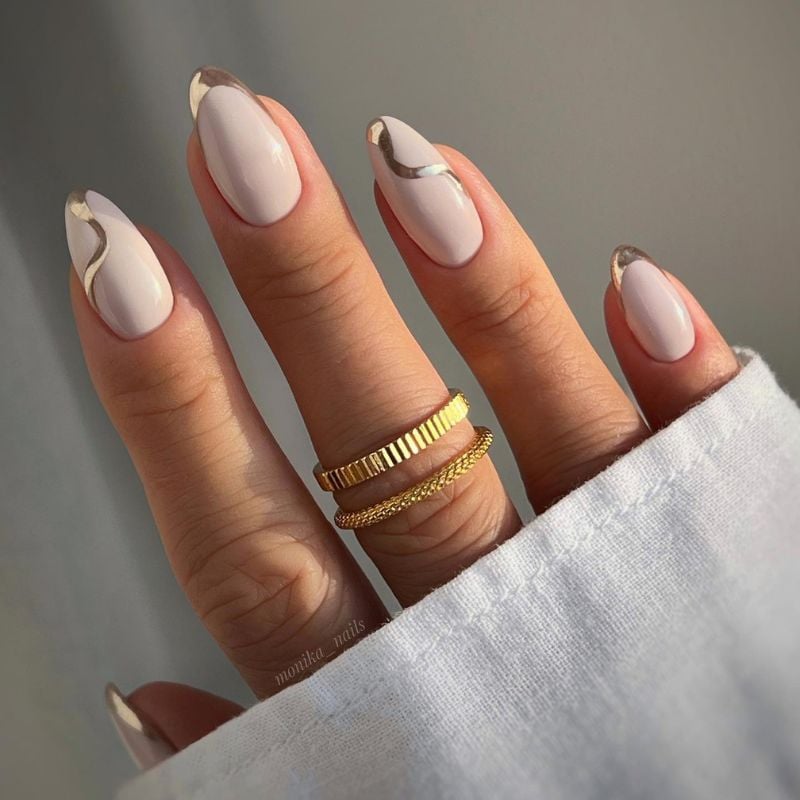These almond-shaped nude nails feature flowing gold wave accents. The soft metallic lines create an artistic and luxurious manicure.