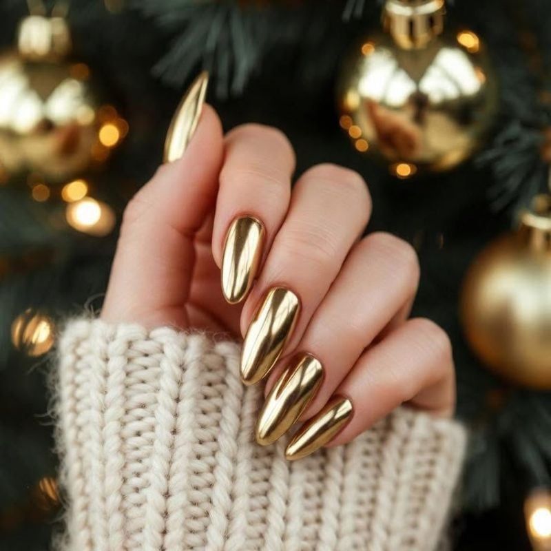 These long chrome gold nails shine with a mirror-like metallic finish. The festive background and glossy texture make this design perfect for holiday celebrations.