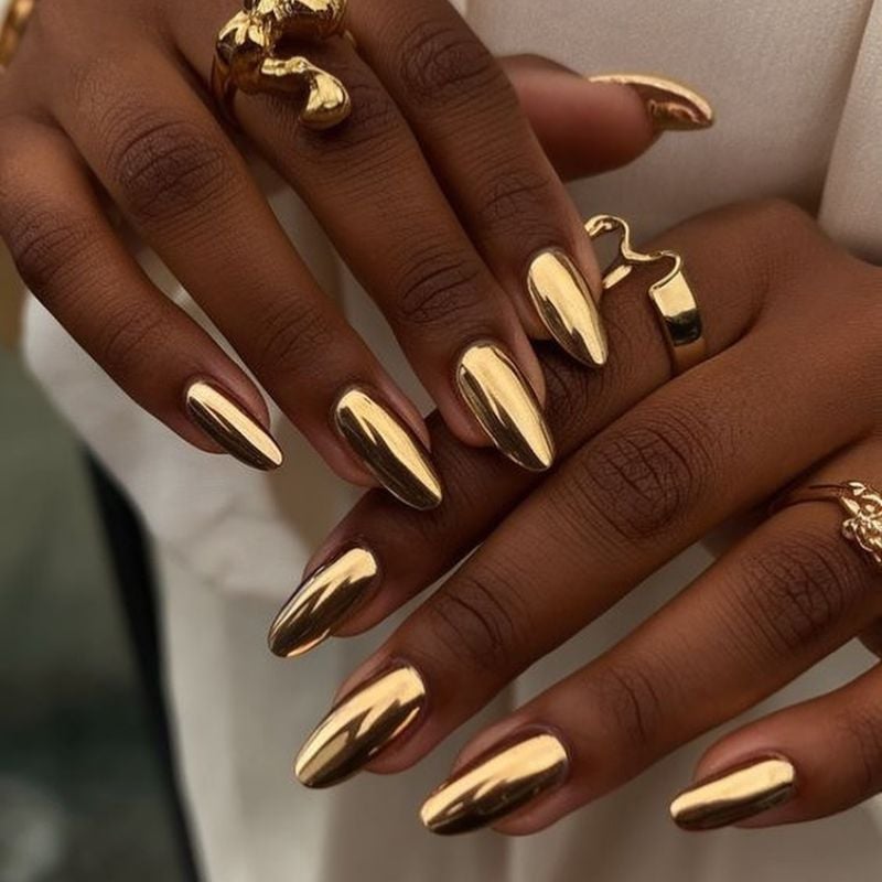 A stunning rose gold chrome finish gives these nails a mirror-like shine. This bold gold nail design reflects light beautifully and adds a luxurious modern touch.
