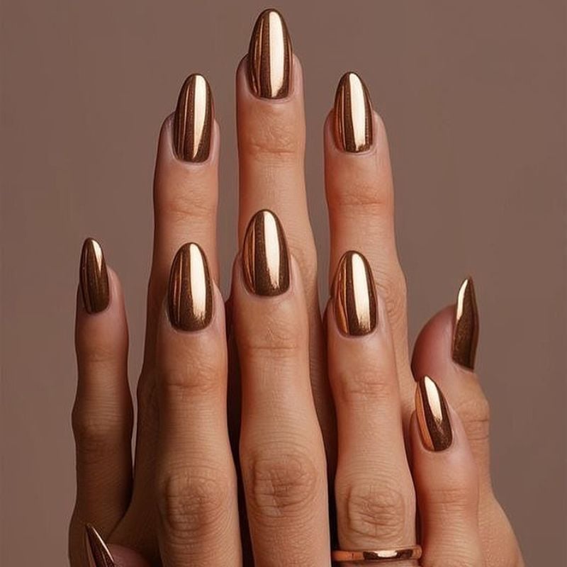 A warm bronze-gold chrome polish creates a rich and sophisticated manicure. The almond nail shape enhances the elegant metallic glow.