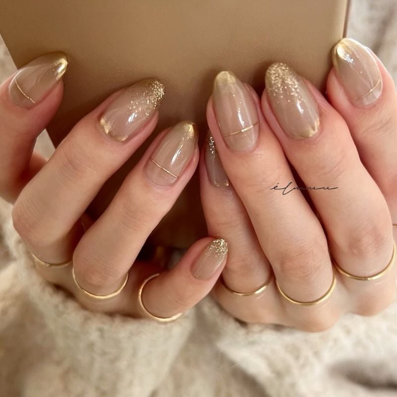 29. Nude Nails with Gold Tips and Flakes