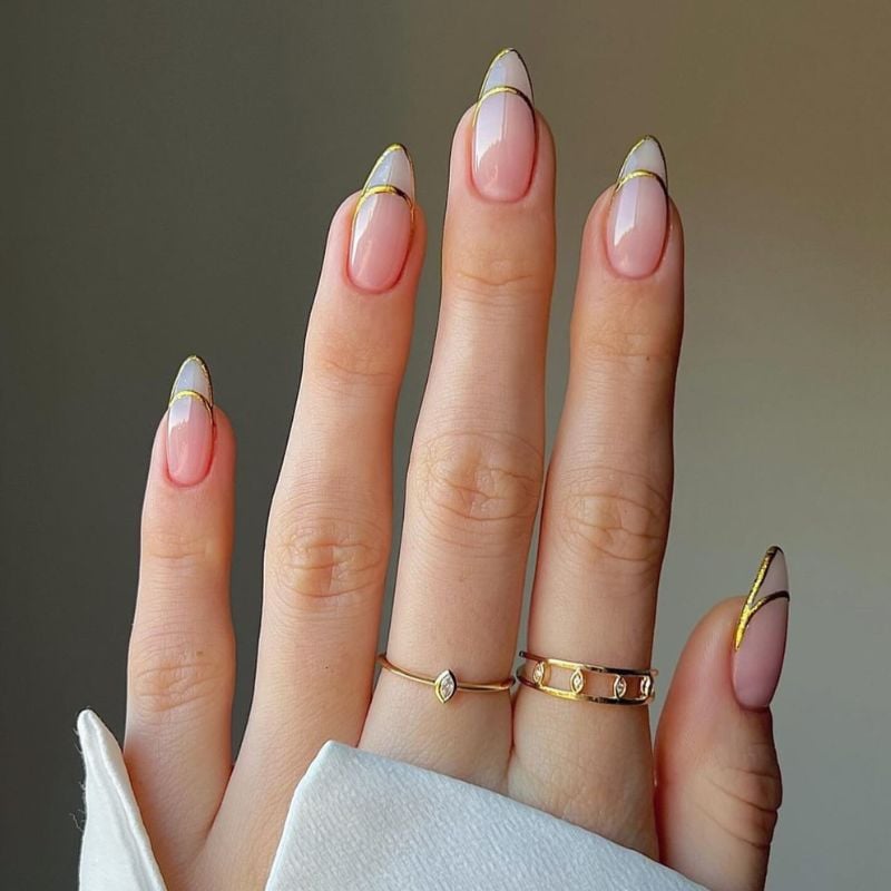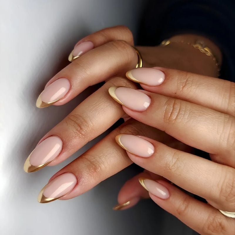 20. Almond Nude Nails with Thin Gold Tips