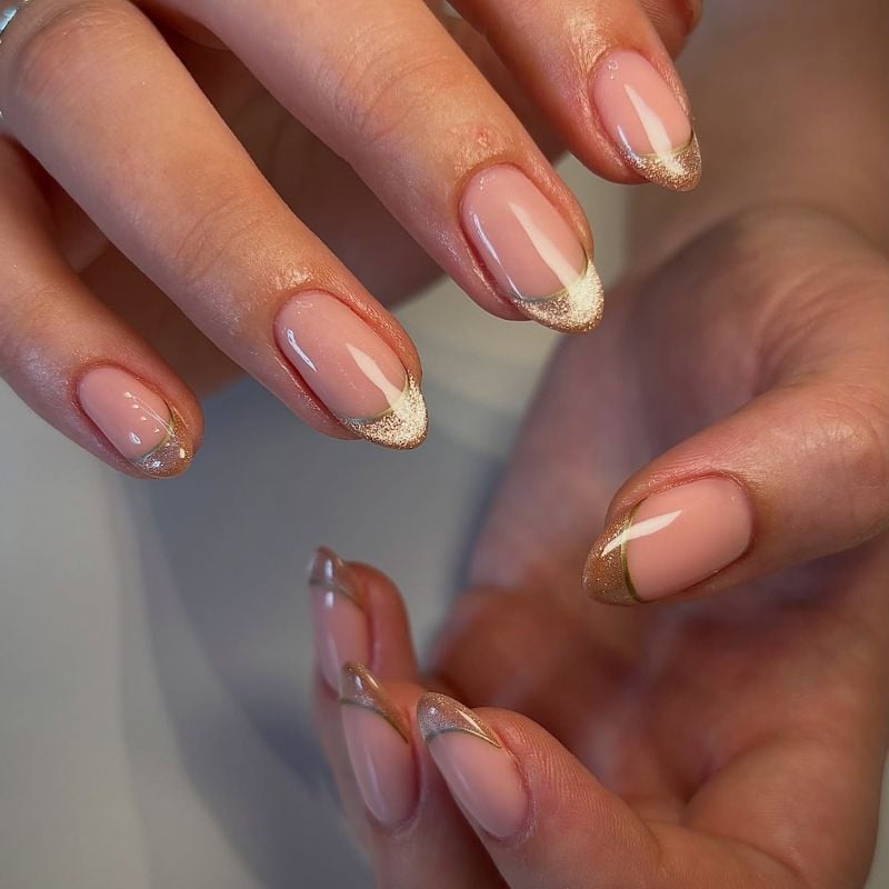 Soft nude nails paired with shimmering gold glitter tips create a delicate and glamorous gold nail design. This look is perfect for weddings or special events.