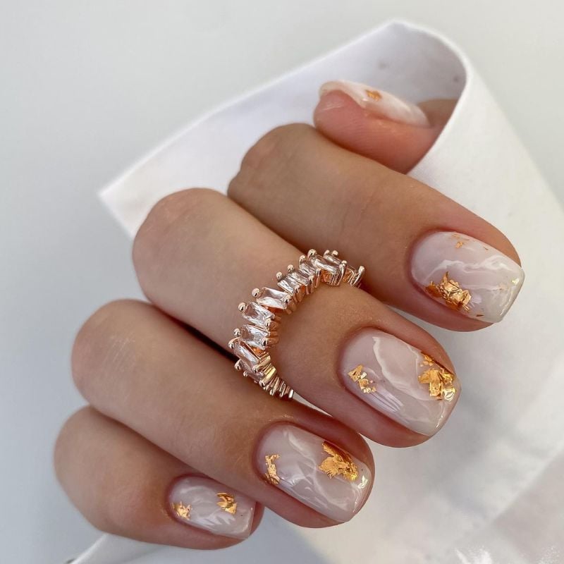 This manicure combines a creamy marble effect with delicate gold foil accents. The blend of white tones and metallic flakes creates a refined and artistic gold nail design.