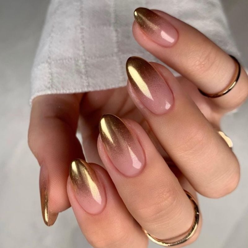 These almond-shaped nails feature a beautiful gold chrome ombre that fades into a soft nude base. The gradient effect creates a luxurious and modern manicure.