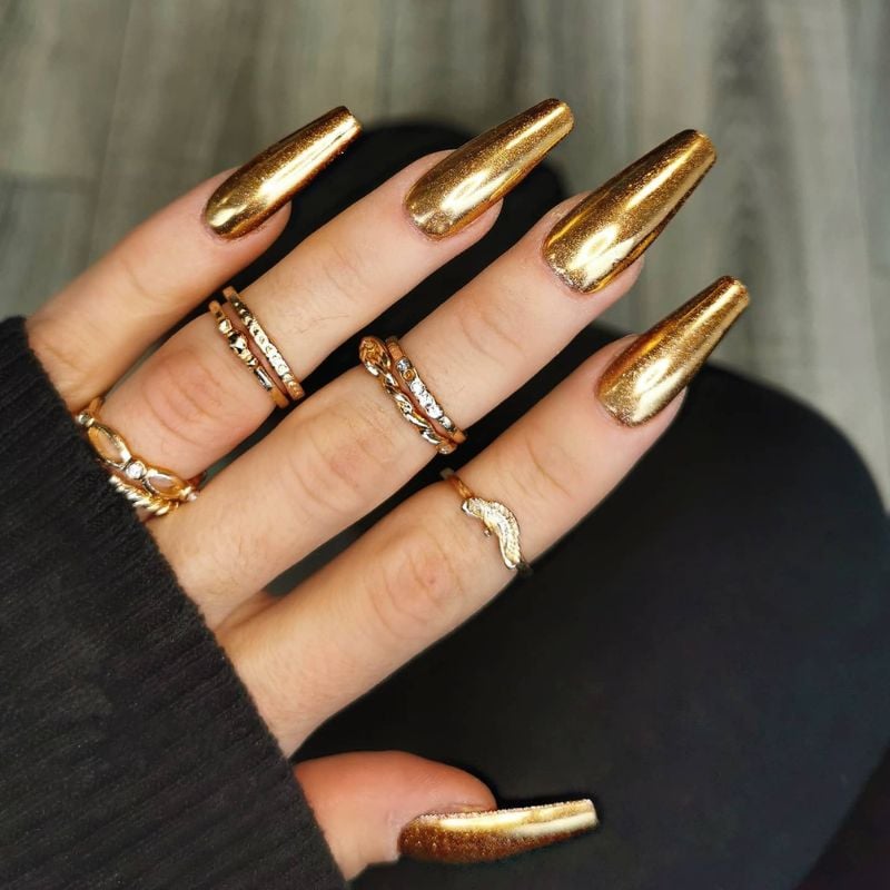 A deep bronze chrome finish gives these nails a sleek metallic look. The smooth, reflective surface creates a bold, modern gold nail design.
