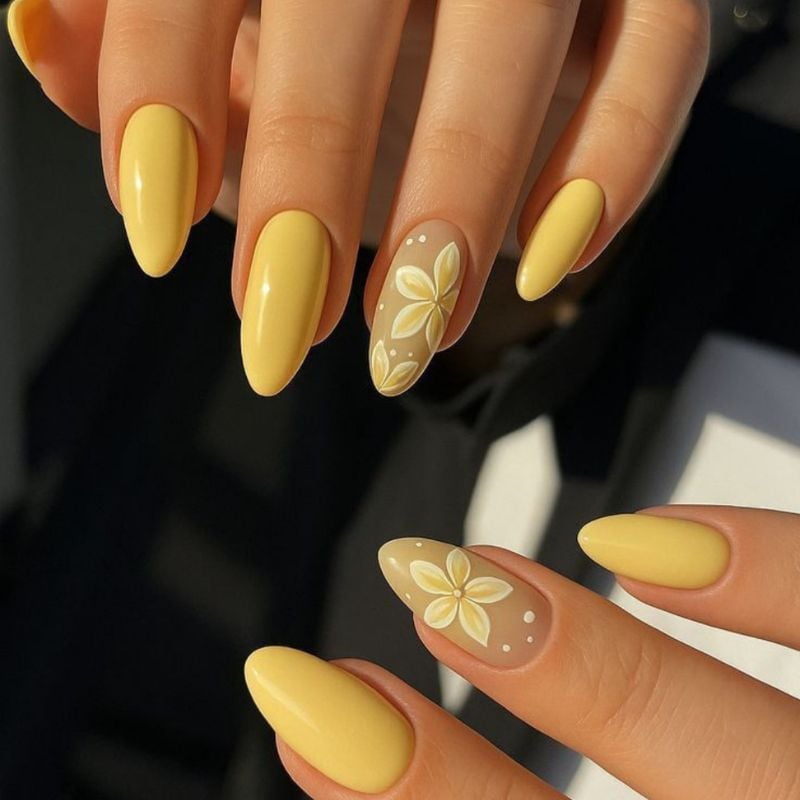 Soft butter-yellow almond nails with delicate white floral accents on a nude base. Bright yet elegant, this design captures early April sunshine beautifully.