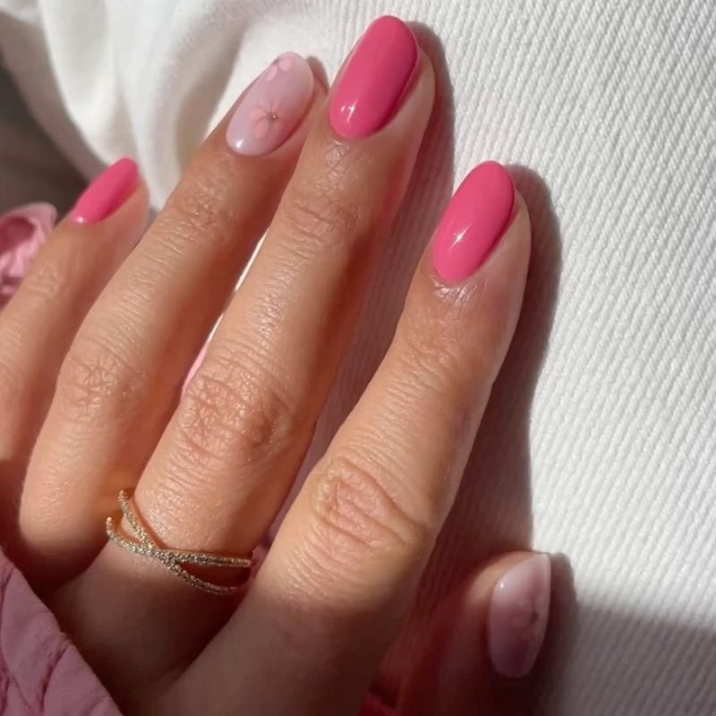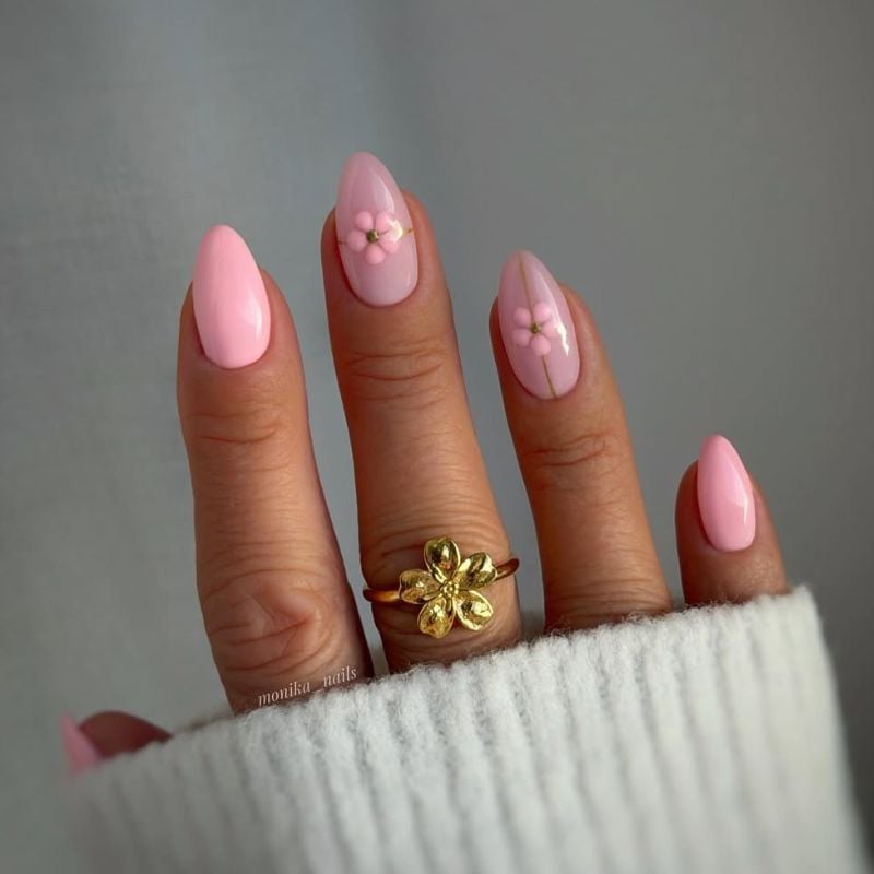 Soft, glossy pink almond nails with delicate floral accents in the center. Feminine, simple, and perfectly aligned with the April bloom season.