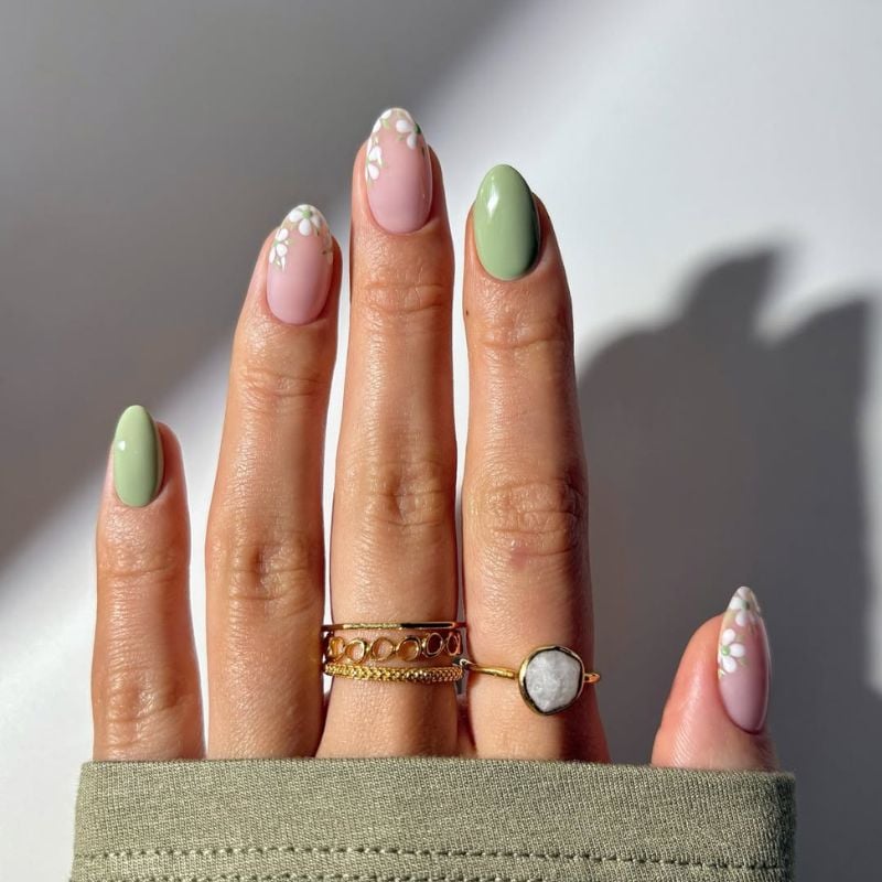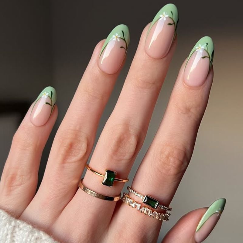 Muted sage green French tips paired with fine white floral detailing. Fresh, elegant, and very “mid-April garden.”