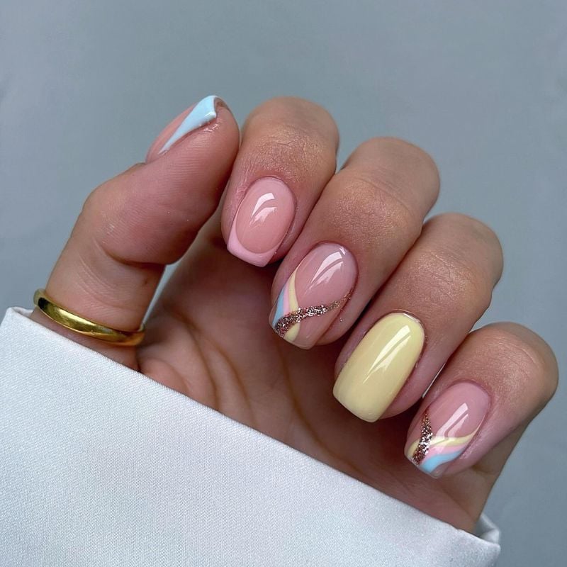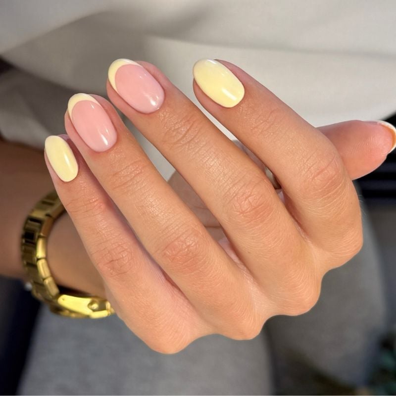 Alternating pale yellow and blush tones with a glossy finish. Clean, bright, and effortlessly April-ready.