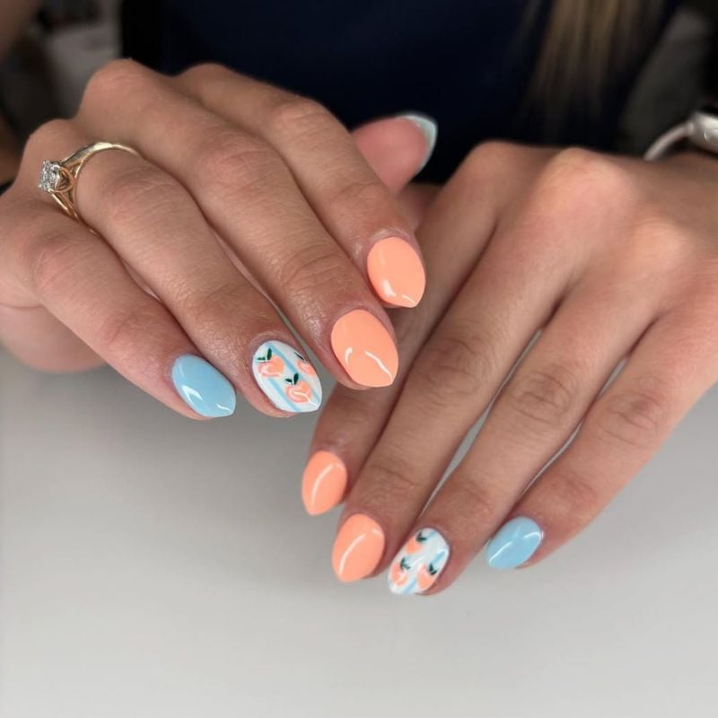 Soft peach and baby blue nails with tiny floral accent art. Light, cheerful, and perfectly transitional into warmer days.