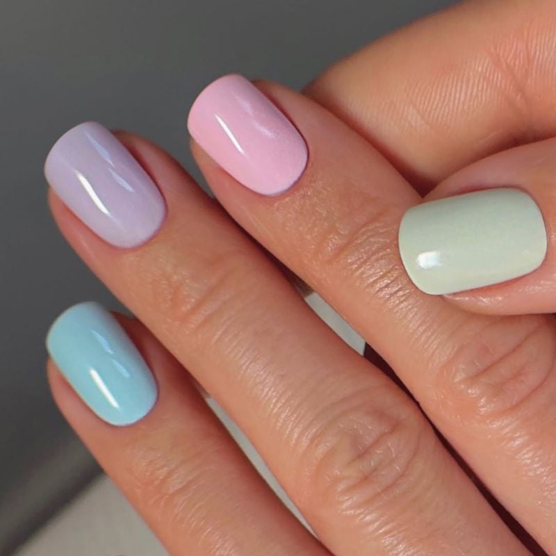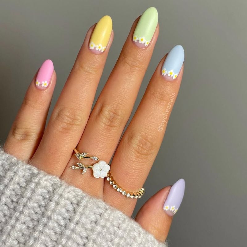 Yellow, mint, pink, and lavender pastel nails with tiny daisy accents along the cuticle line. Playful, colorful, and perfectly seasonal.