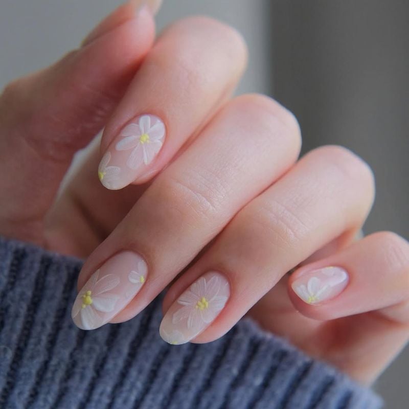 Transparent nude base with hand-painted white flowers and yellow centers. Delicate and airy, like early April petals.
