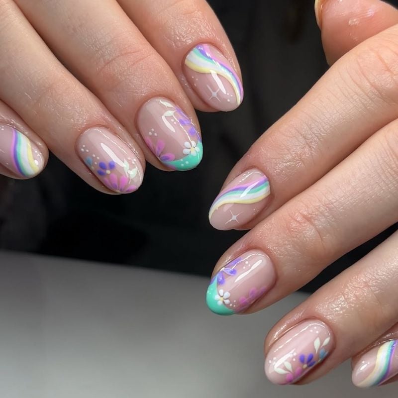 Soft nude base with pastel rainbow French tips and tiny floral details. Fresh, artistic, and playful for April sunshine.
