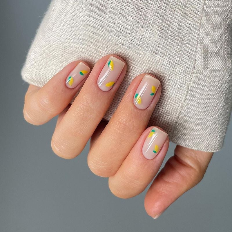 A sheer pink base with tiny yellow lemon accents and green leaves gives a fresh, clean look. Playful but subtle, perfect for everyday spring style.