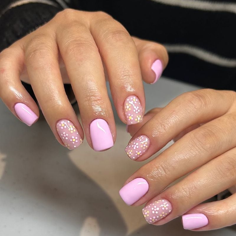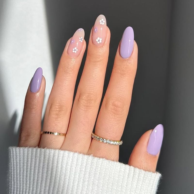 Solid lilac nails combined with a nude accent featuring tiny white blossoms. Feminine, polished, and perfectly balanced for mid-April.