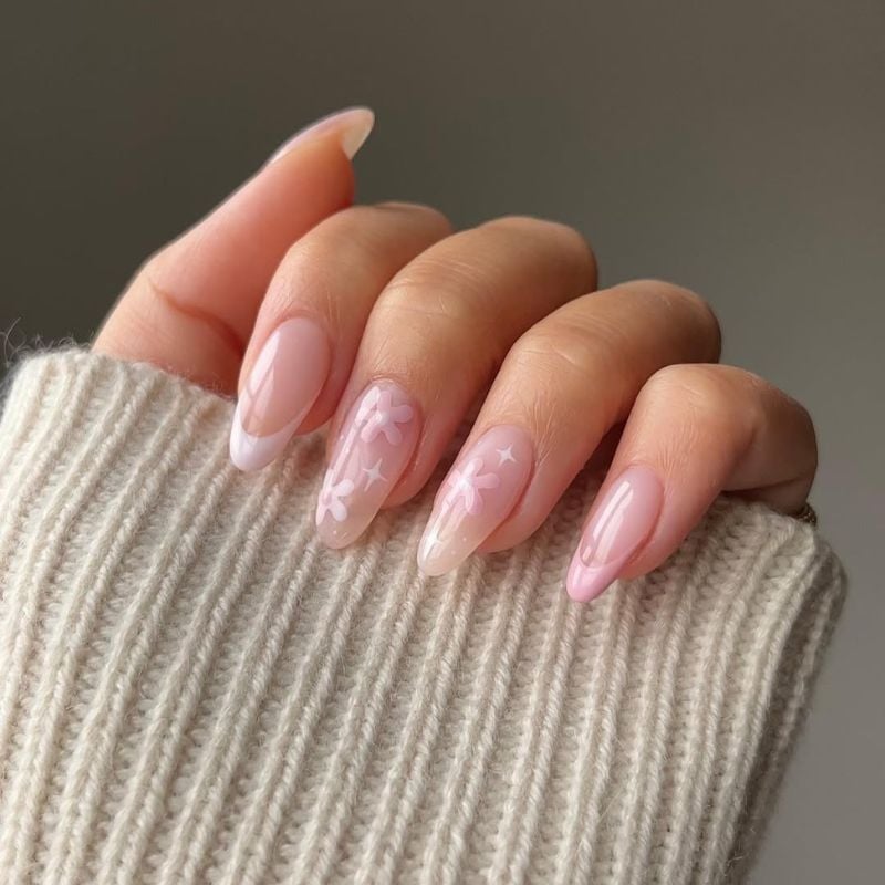 Glossy translucent pink almond nails with soft white floral accents and subtle sparkle details. Delicate, romantic, and effortlessly April-ready.