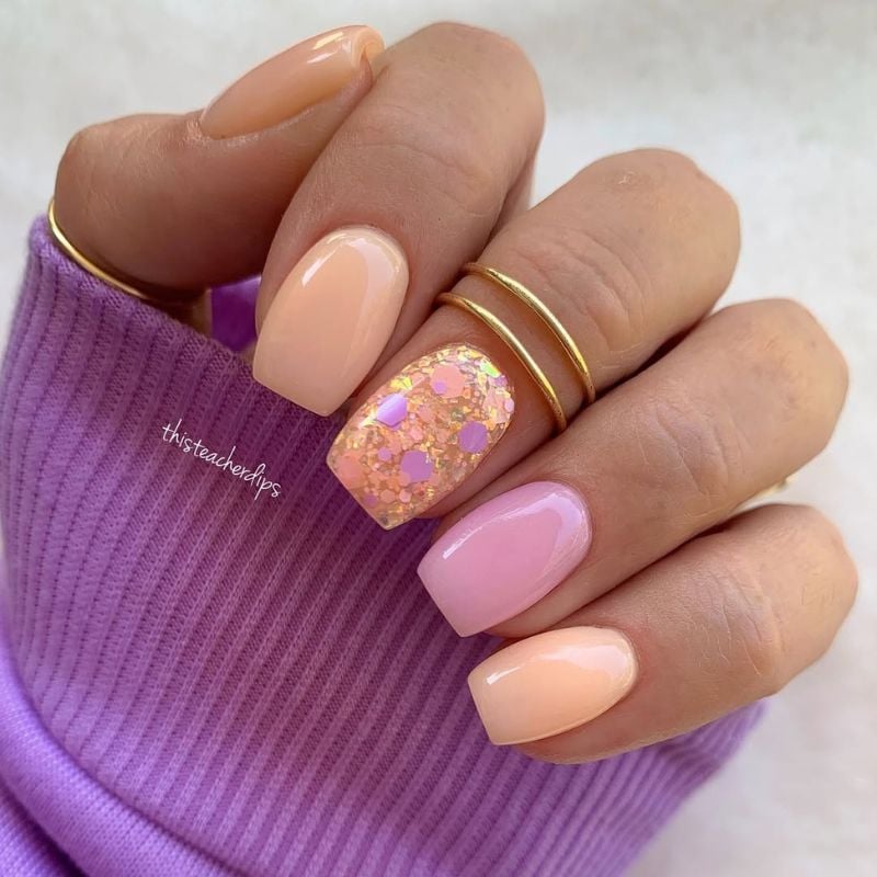Soft peach and blush tones paired with a chunky gold-and-lilac glitter accent nail. Bright, cheerful, and full of spring energy.