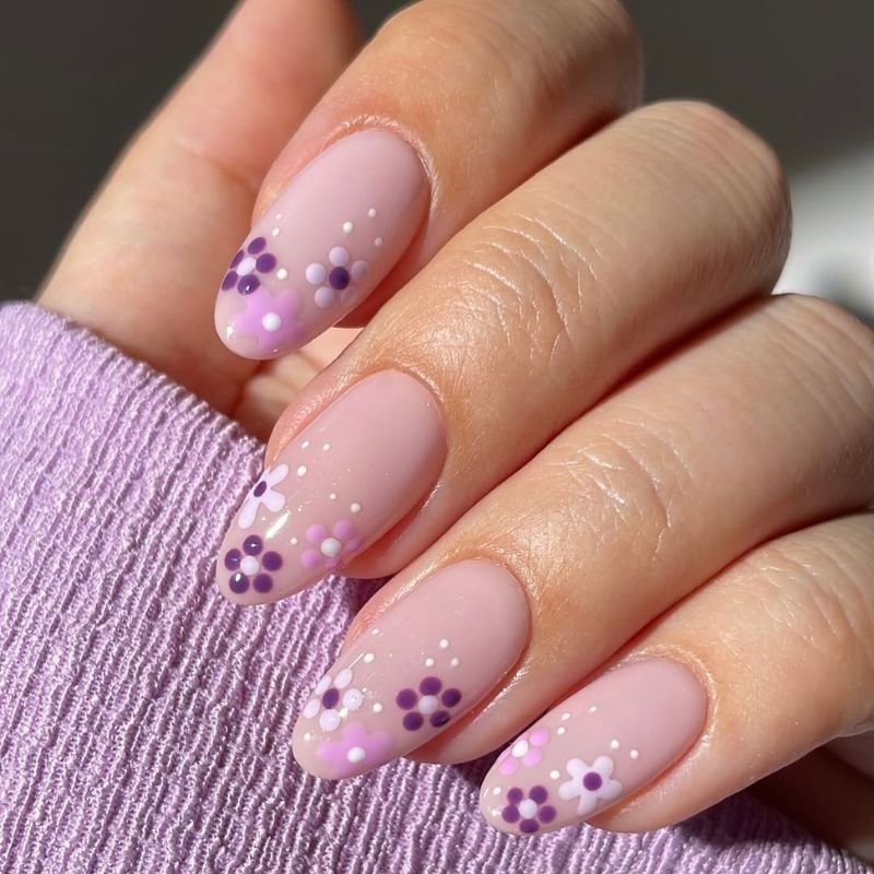 Soft matte blush base with layered purple floral dot detailing. Subtle yet artistic, a modern twist on April florals.
