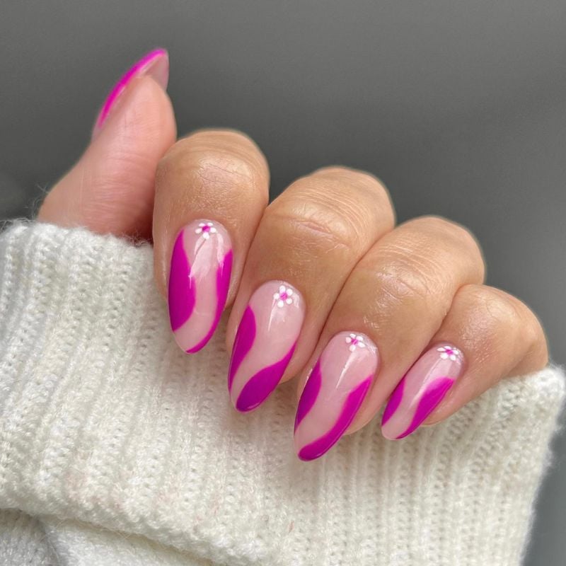 Bold fuchsia waves over a glossy nude base create movement and energy. The tiny floral detail adds a soft seasonal touch.
