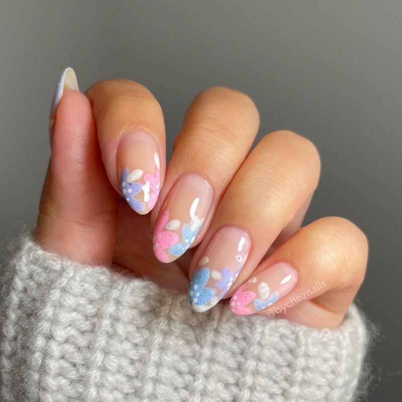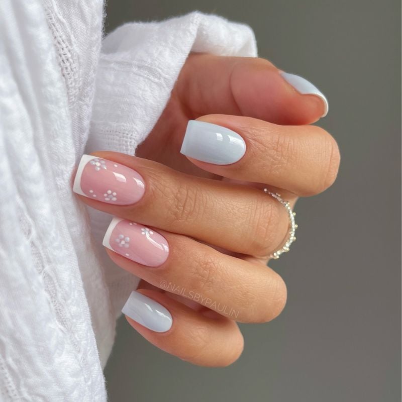 Alternating baby blue and blush nails with micro daisy accents. A modern French-inspired look that feels fresh and polished.