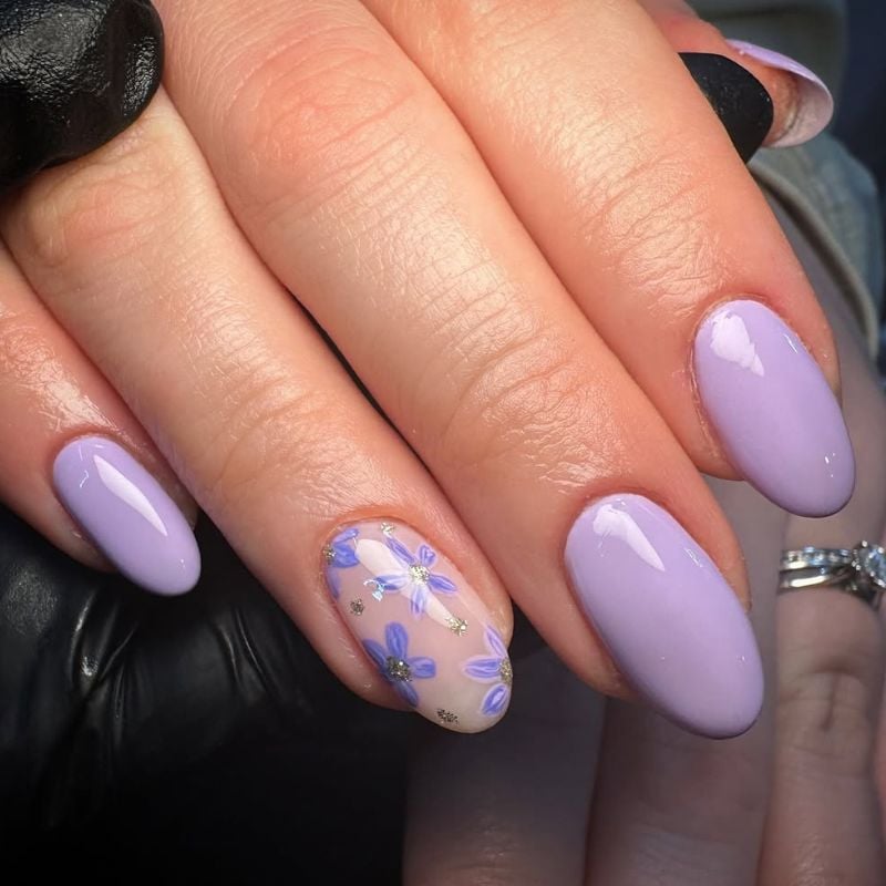 Glossy lavender nails paired with a floral accent nail featuring delicate purple blooms and subtle sparkle. Feminine and calm.