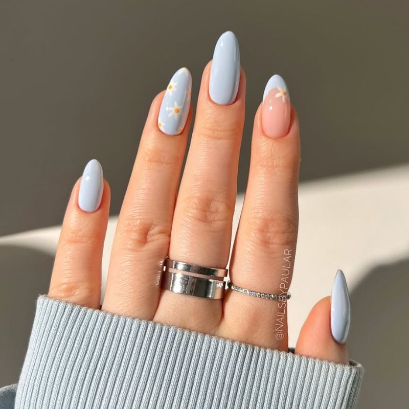 Cool pastel blue paired with nude accents and tiny white daisies near the cuticle. Clean, minimal, and spring-perfect.