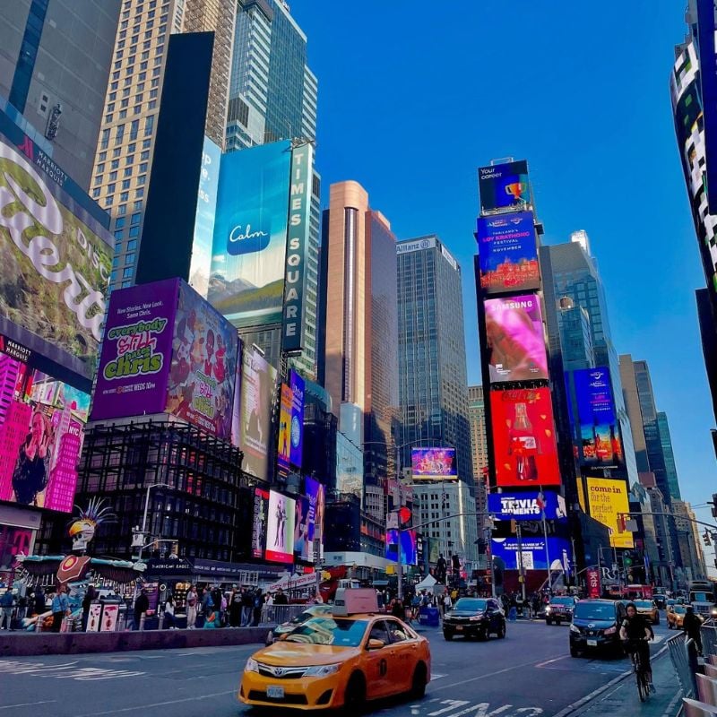 Electric energy of NYC, neon billboards, yellow cabs, and people movement.