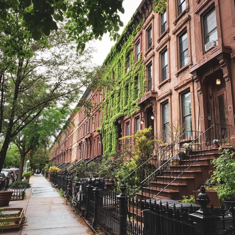 Classic New York residential street aesthetic, ivy, iron railings, and brownstone stairs.