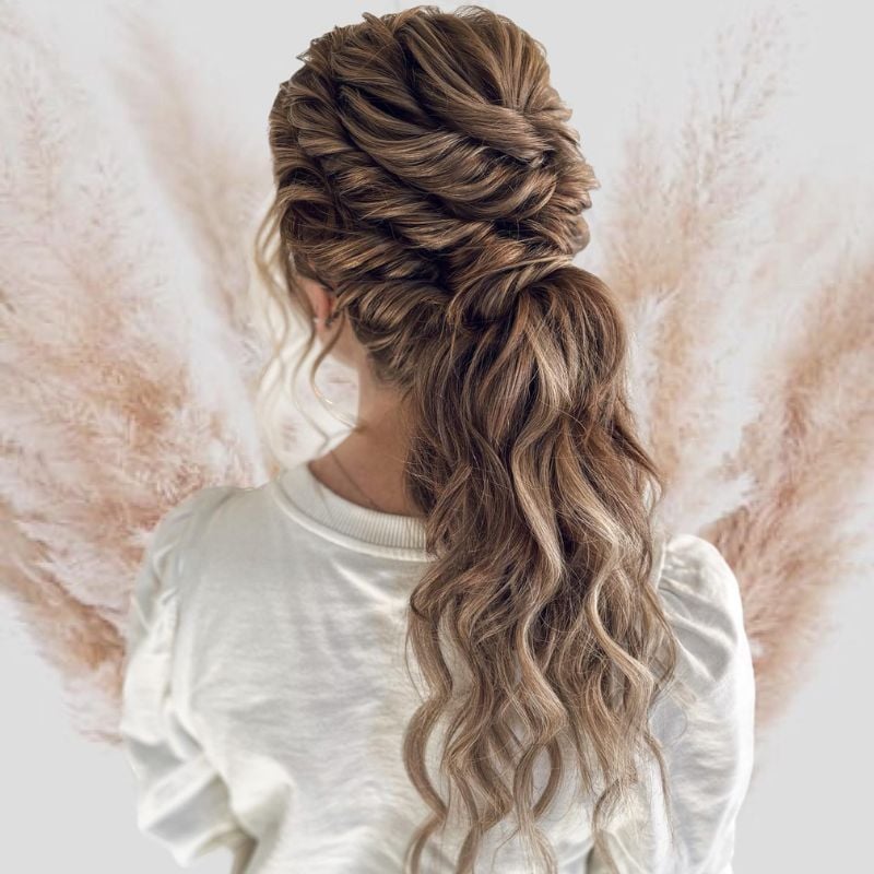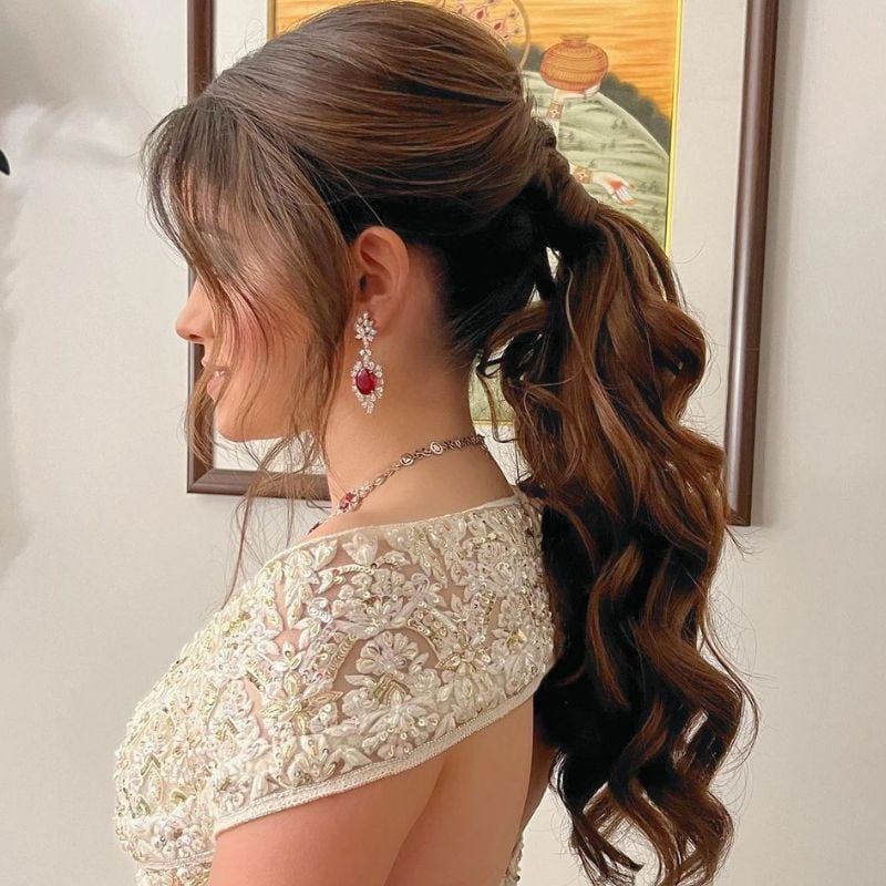 A voluminous ponytail with flowing curls for a soft, romantic look. Perfect for weddings or engagement parties.