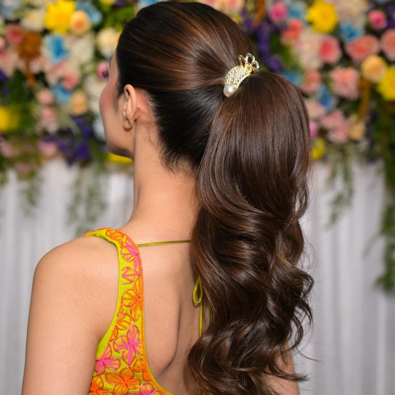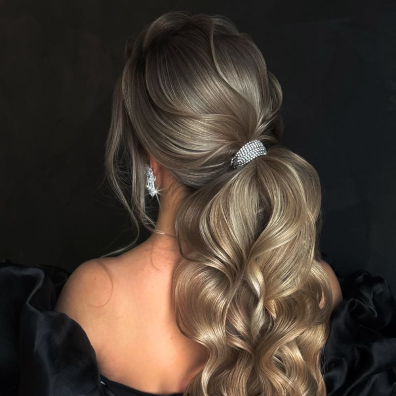 A sleek ponytail with glossy waves cascading down the back. Great for elegant parties or evening events.