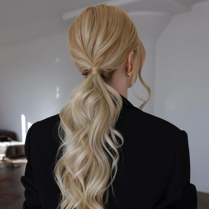 A relaxed low ponytail with loose waves and a wrapped base. Ideal for casual outings, brunch, or effortless everyday style.