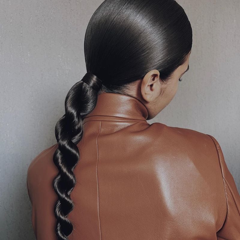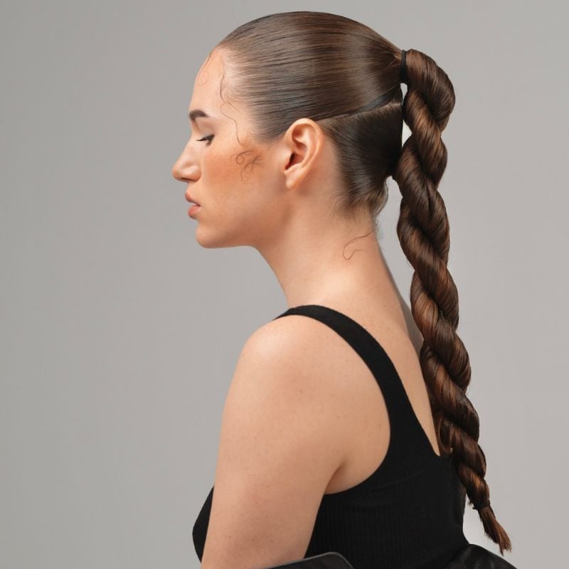 A high ponytail styled into a thick rope braid for a dramatic look. Perfect for fashion-forward events or parties.