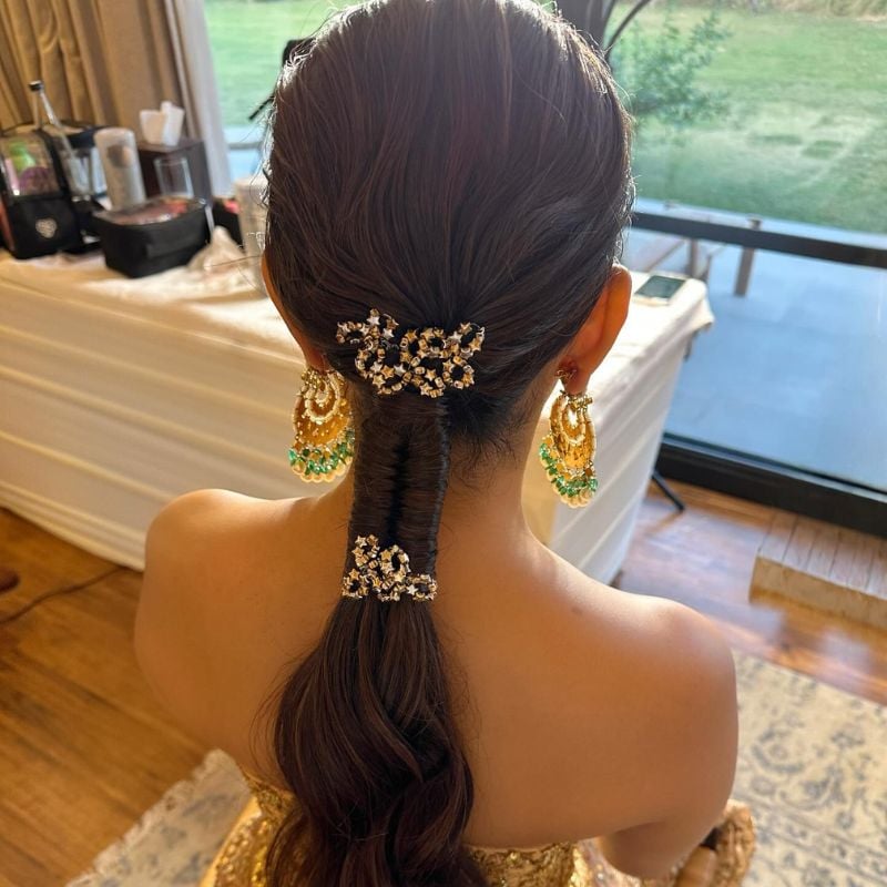 A sleek ponytail decorated with sparkling hair accessories for a luxurious effect. Perfect for weddings or festive celebrations.