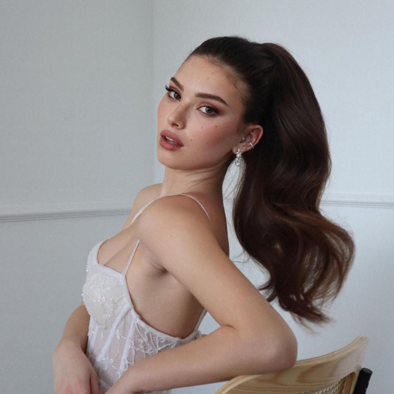 A soft ponytail with face-framing layers and voluminous curls. A beautiful option for weddings, engagement parties, or romantic evenings.
