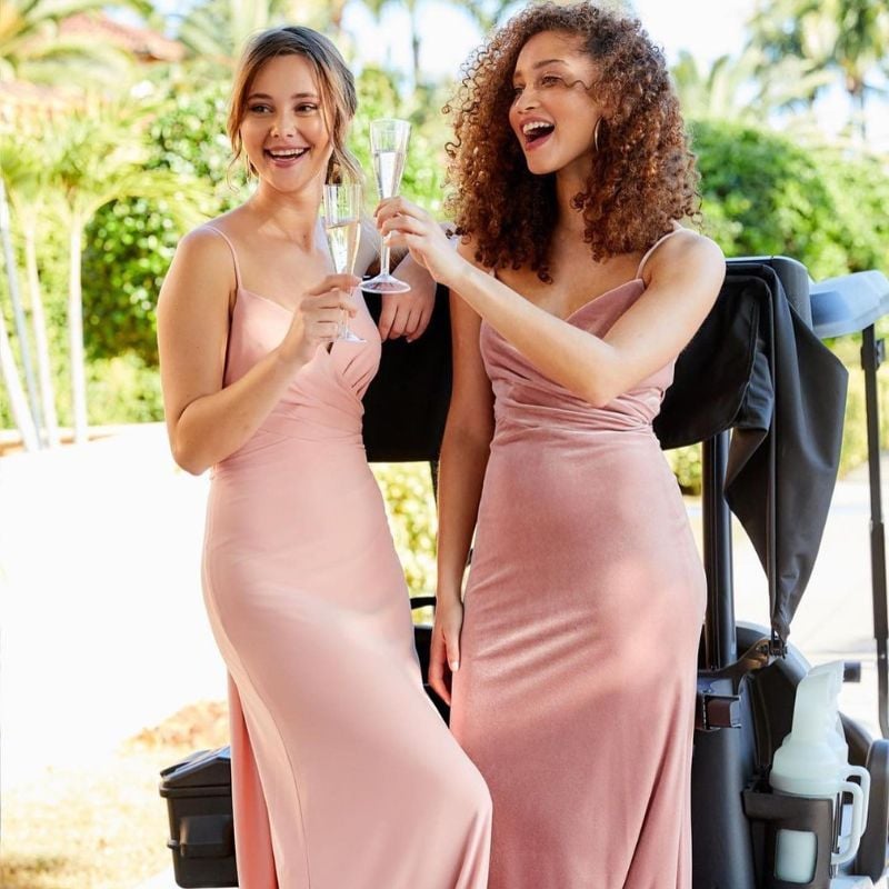Soft blush satin slip dresses with thin straps and a fluid silhouette. Perfect for garden weddings or daytime outdoor receptions.