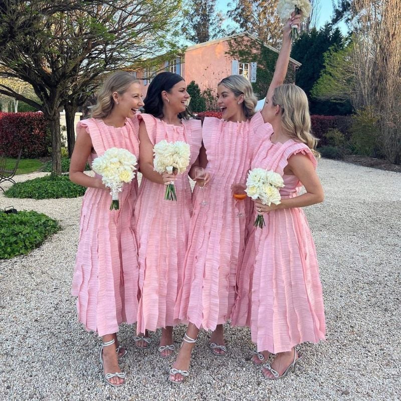 Textured blush dresses with soft ruffle details. Best suited for spring garden weddings or outdoor receptions.
