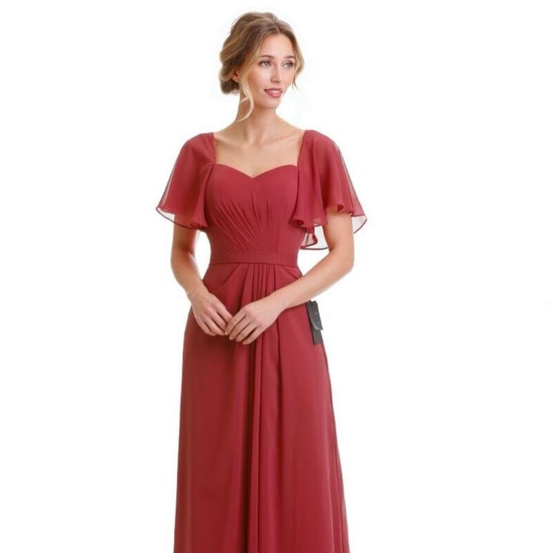Soft burgundy gown with flutter sleeves and sweetheart neckline. Beautiful for fall daytime weddings or indoor evening receptions.