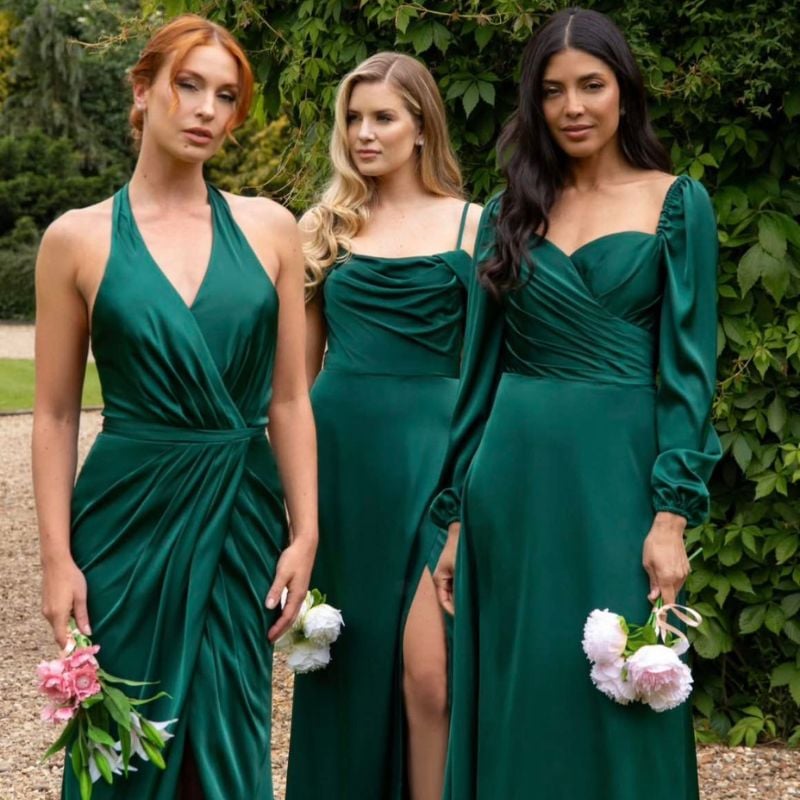 Deep emerald wrap-style gowns with varied necklines. Perfect for garden weddings or elegant outdoor ceremonies.