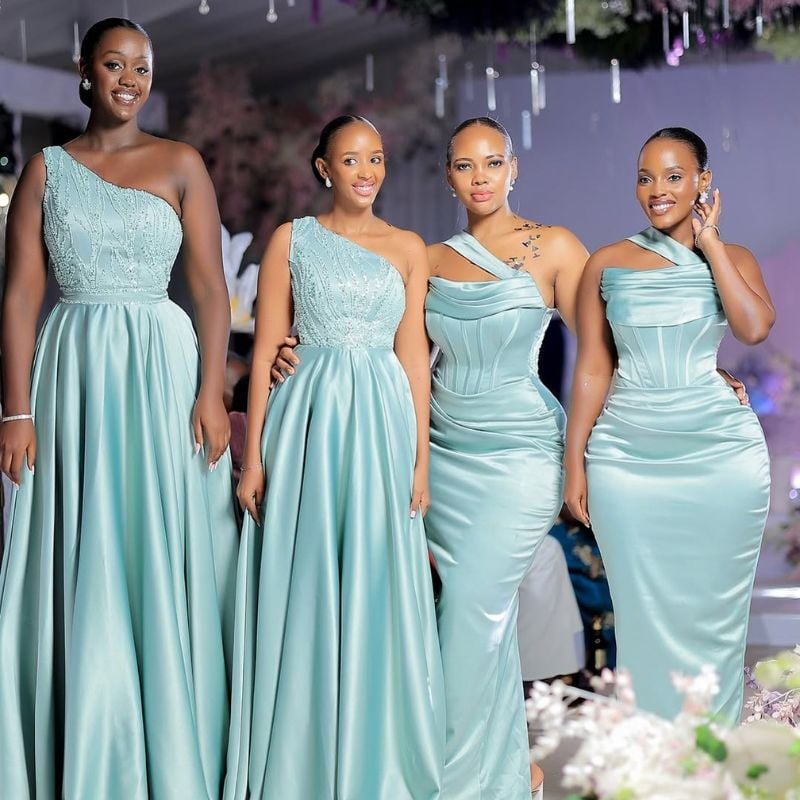 Soft mint satin dresses with structured bodices. Ideal for indoor night weddings or ballroom receptions.