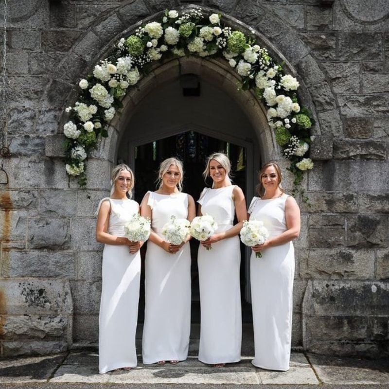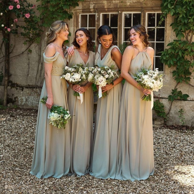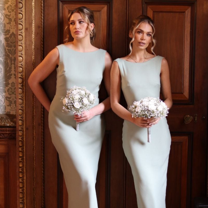 Clean-lined sage dresses with a boat neck design. Ideal for indoor ceremonies or traditional church weddings.