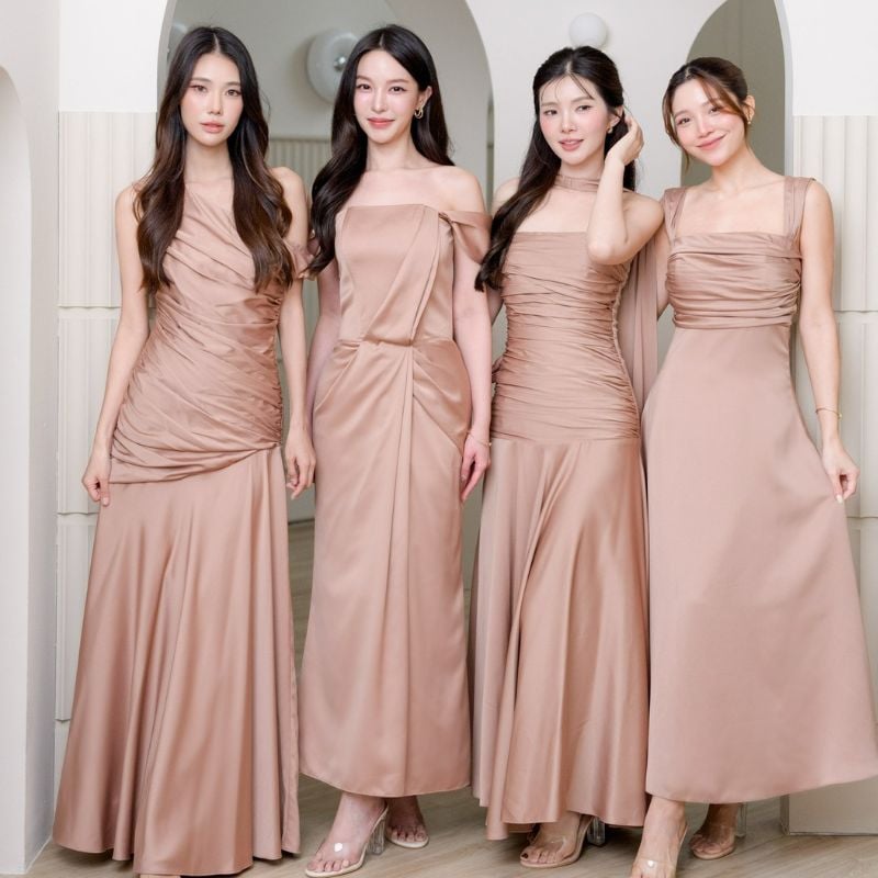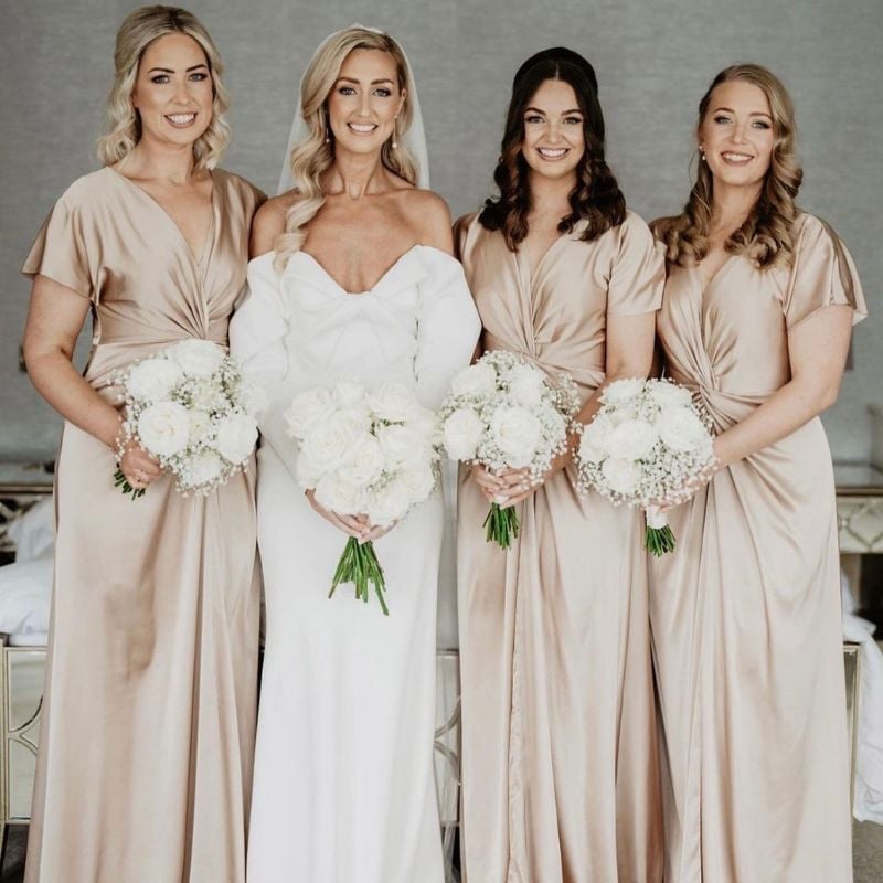 Neutral champagne satin gowns with soft draping. Elegant for evening weddings in closed venues.