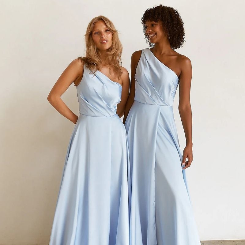 Soft blue A-line gowns with modern asymmetry. Perfect for summer outdoor weddings or lakeside venues.