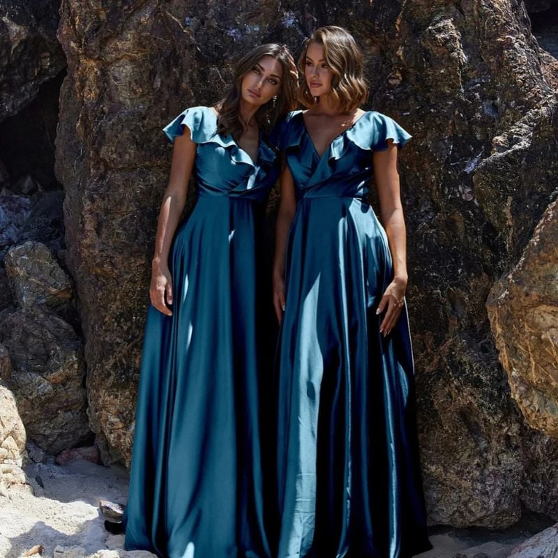 Deep teal wrap dresses with ruffle detail. Stunning for beach ceremonies or sunset outdoor weddings.